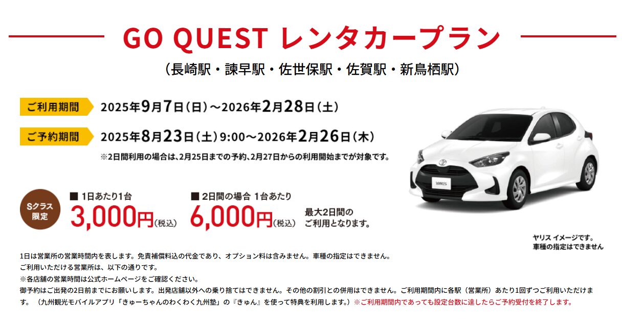 ここまでフリーきっぷの良さを語っておいてなぜレンタカーなどといった単語が出てくるかといいますと、GO QUEST西九州フリーきっぷと同じタイミングでレンタカーのキャンペーンも行われています。1日だと3,000円。2日だと6,000円で借りれたりします。