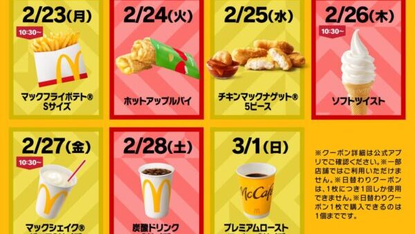 | 2/23(月・祝) | マックフライポテトS | 200円 | 100円オフ | 10:30~閉店 |