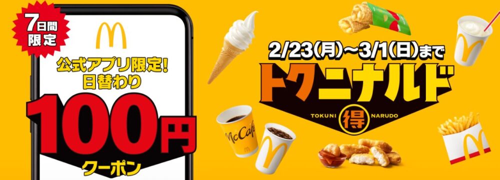 マクドナルドは、2026年2月の最後の7日間、1週間限定で「トクニナルド」キャンペーンと称して、サイドメニューが100円となるキャンペーンを発表しました。